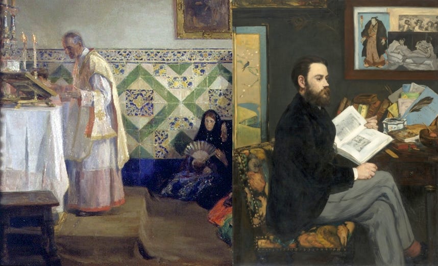 Today, I’d like to treat my readers and listeners to a delightful passage from a nowadays seldom-read work of French literature (in translation, of course). The author is Émile Zola, the novel is Abbé Mouret’s Transgression, the passage is chapter 2 of Book I — very near the start. What I find so striking about this chapter is how vividly and beautifully Zola can narrate the words and rituals of a Low Mass in spite of his being a notorious unbeliever, distant from the Church. In this literary exercise, the Mass is a little disturbed by the bustling of the priest’s maid, the 60-year-old “La Teuse”; still, any traddy will find himself right at home.