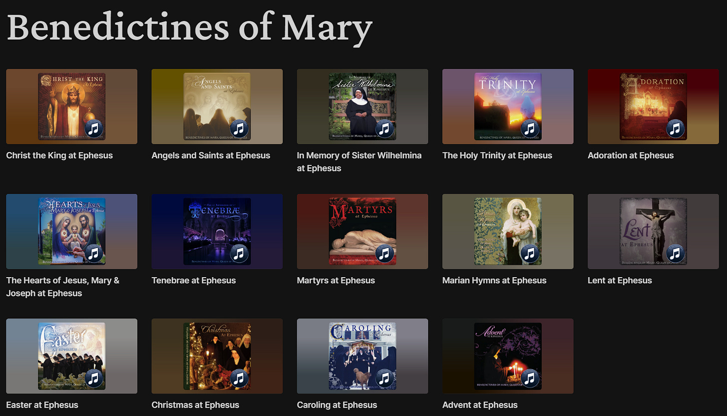 If you’ve never listened to the angelic singing of the Benedictines of Mary in Gower, Missouri, you’re in for a treat! They have recorded many acclaimed albums over the years, featuring a selection of chant, polyphony, and hymnody sung with exquisite perfection. The entire library is now available at Pelican+, as you can see in this screenshot: