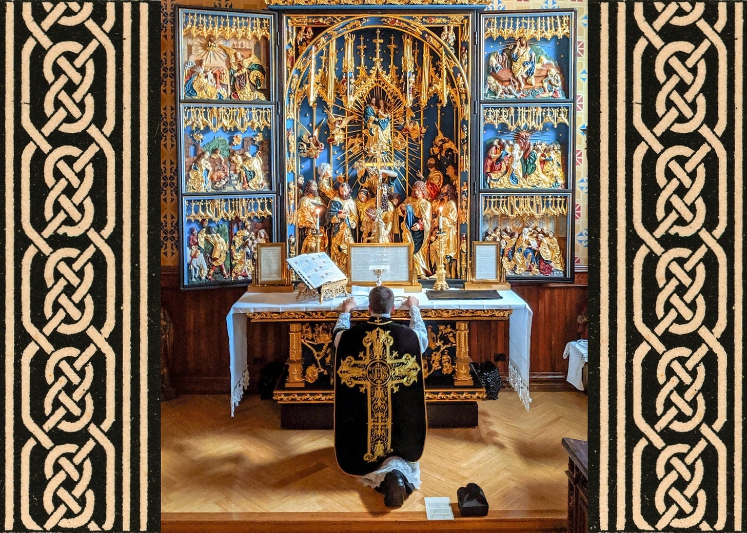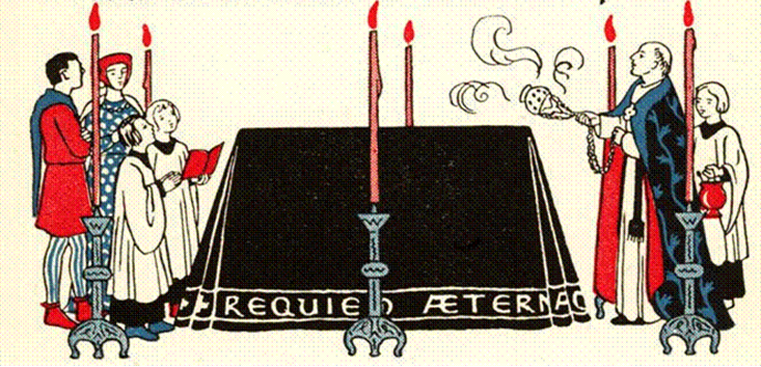 That illustration is charming...except that the servers in their Medieval haircuts look a little too much like "altar girls." On a more serious note: my wife and I decided to sell our cemetery plot where some of my family are buried and buy plots at the traditional chapel where we normally go to Mass. The reason? So we can be sure someone will pray for us after we have died. That accords with my daily affirmation: "I need all the help I can get!"