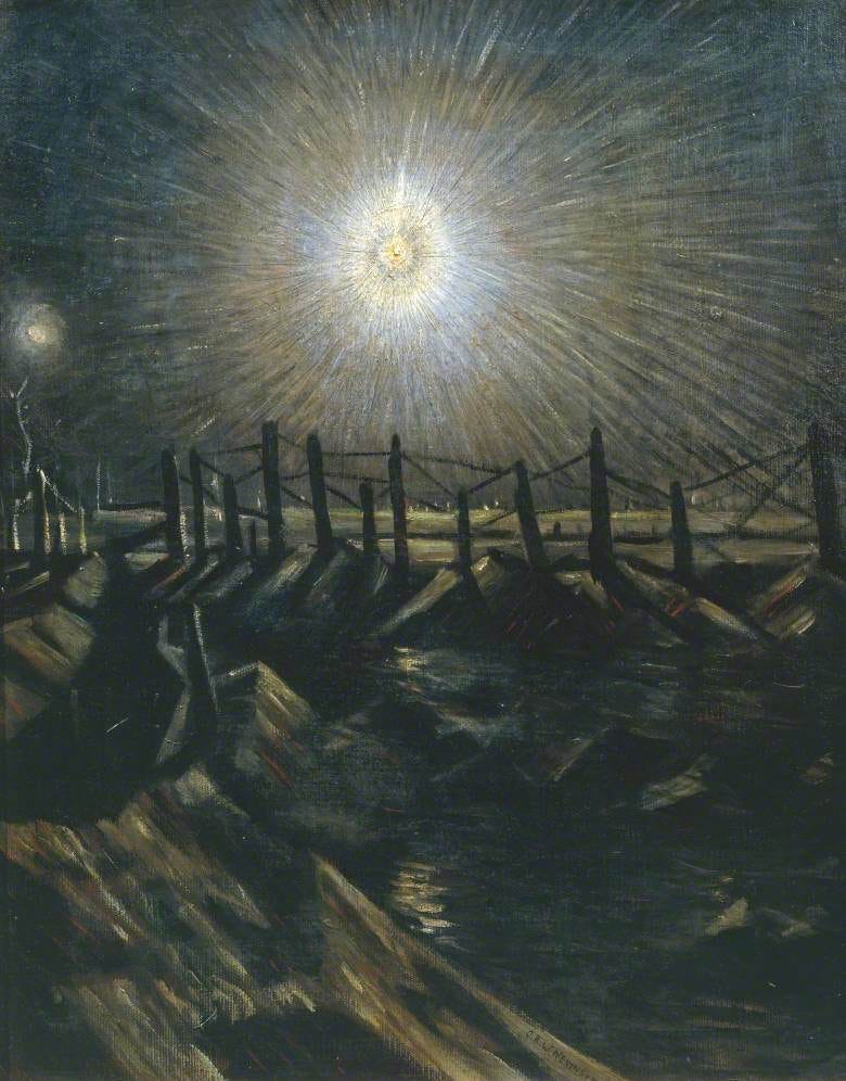 A generation went to its doom. The kindly lamps of Christian Europe had all gone out, replaced by the red fire of machines in the night. Star shells illuminated ghastly scenes of the numberless dead, unburied where they lay amid the endless barbed wire and reeking craters. The very air was poison. Each night the world was dissolved in flames, and each morning found great hoards of men lying under blasted earth, reduced to dust and ashes. Often, enemies went to eternity locked in each other’s embrace, some in postures of rage, others in forgiveness and pardon.